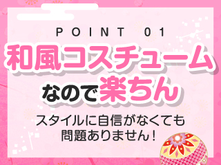 和服コスチュームなので体のラインがかくれてゆったり楽ちん、スタイルに自信がなくても大丈夫!