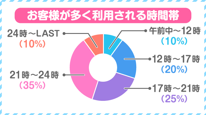 中島さんー はい! 今日なんかも、12時から入った子がすぐお仕事につけてました。どの時間帯でもまんべんなくお客様が入るので、朝昼しか入れない子も、逆に夜しか入れない子も、安心してご応募いただければと思います。