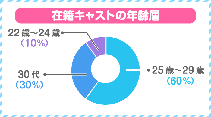 タッキー店長- 在籍キャストの年齢層は、25歳〜26歳が最も多く、全体の6割を占めています。次いで30代が3割、20代前半が1割といった構成です。30代でも十分に活躍できますよ。実際に、30代の在籍キャストで1日5万〜7万円を稼ぐ方もいます。