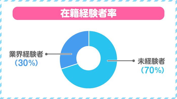 タッキー店長- 在籍キャストは未経験者が多く、全体の6〜7割を占めています。未経験からでもランキング上位に入る女性はたくさんいますよ。年齢や経験に関係なく、それぞれの素質や愛嬌を活かせるのが当店の強みです。