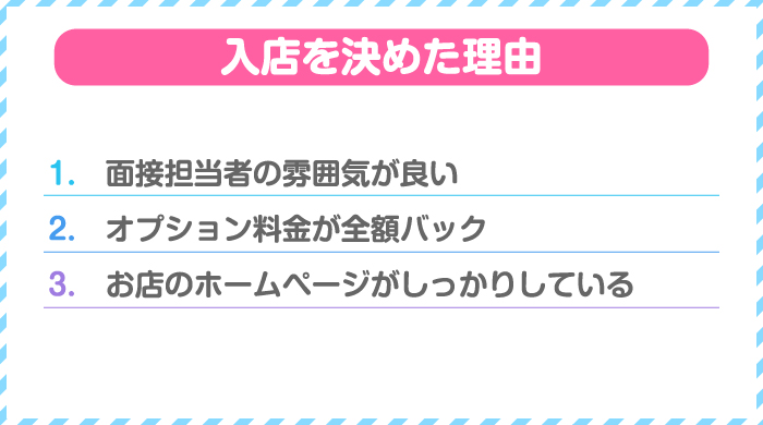 タッキー店長- 面接時の対応や雰囲気が決め手になったという声が圧倒的に多いです。「安心して働けそう」だと思ってもらえているようです。あとはオプション料金全額バックや公式サイトなどですね。