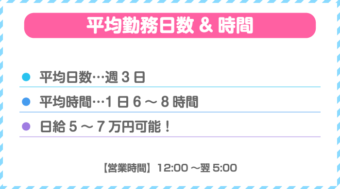 タッキー店長- 平均的な出勤日数は週3日です。週5日などしっかり出勤するキャストさんもいますが、最も多いのは週3日です。1日5〜7万円を稼ぐキャストさんもいるので、週に15万円以上稼ぐことも十分に可能です。