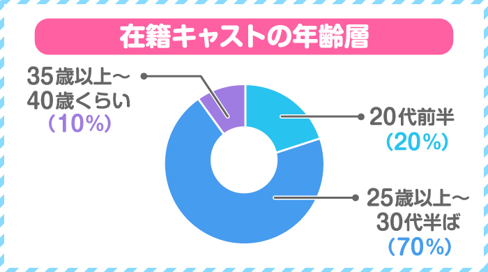 山中さんー 一番下は20歳から、上は40歳くらいまでと幅広いです。特に多いのは25歳~30代前半ですね。タイプも様々ですが、「がっつりサービス」というよりは、本当にカジュアルな雰囲気で働けるお店なので、やはり未経験の方が多数いらっしゃいます。
