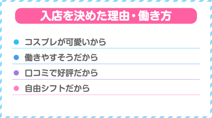 山中さんー 「コスプレが可愛かった」が多いですね。「どうせ働くならちょっとでも可愛く仕事したい」というコスプレ好きさんが多いです。あとは「口コミを見て働きやすそうだと思った」という声もありました。