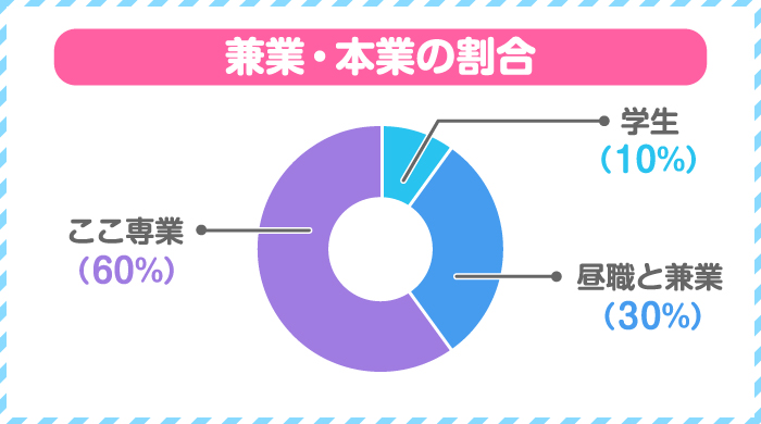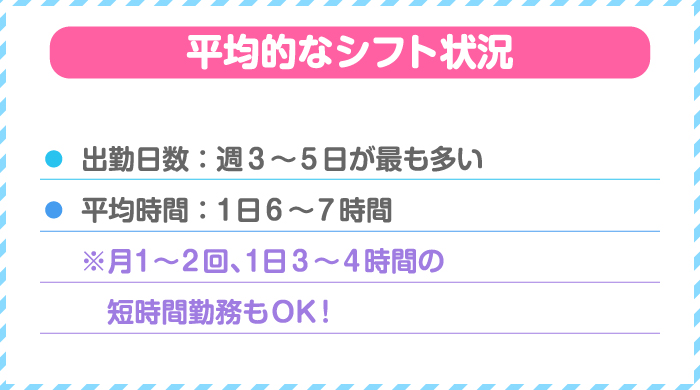 また、何かしらのお仕事をしつつ掛け持ちで働きたいという方も多いため、自由出勤であることも主な理由の1つのようです。兼業しやすい、月に1~2回、3~4時間の短時間出勤もOKな自由シフト制となっております。