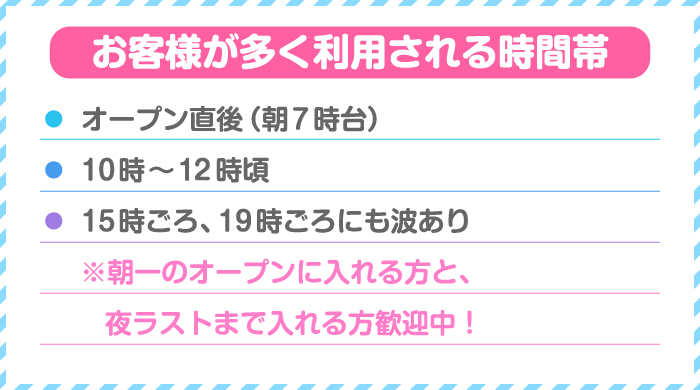 山中さんー オープンしてすぐ(朝7時台)は、料金が一番安く設定してあることもあって、やはりお客様が来られますね。その他、午前中(10時~12時頃)や、なぜか15時頃、そして19時頃にも波があります。日や曜日、月初・中旬・月末などで、集中する時間帯は様々に変わります。