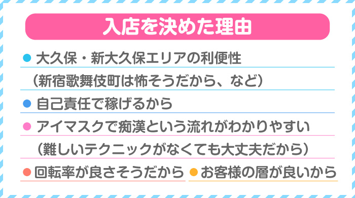 THさん- 一つは、お客様との会話が極力少なくて済むという点です。特に全裸コースは最初の挨拶や会話を必要としませんし、痴漢コースも自然な流れでお客様からのアプローチがあるので、会話に自信がない子でも働きやすいと思います。