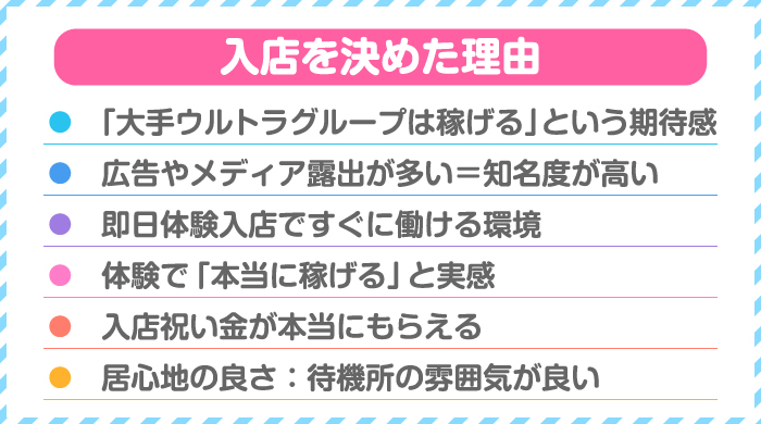 大塚さんー はい、「稼げる」と思っていただけているようです。実際に体験入店の時にお客様がガーッとついて、「稼げるんだな」と思ってくれる方が多いです。それ以外で本入店を決めた理由として多いのは、待機所の居心地がいいという声ですね。高額な入店祝い金も決め手になっているようです。