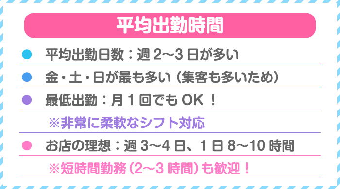やはり出勤の自由度が高いのは当店のメリットです。本当に「2~3時間で出たいんですけど」みたいな方もいるので、全然そこは大丈夫ですよ。