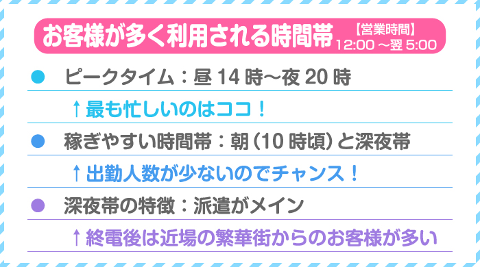 大塚さんー 昼過ぎの14時頃から夜の20時(8時)ぐらいまでにかけてが、忙しさのピークなので、この時間帯に出勤する女性が多いです。