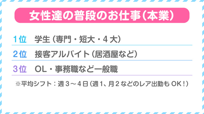 2位は、先ほどもお話ししたオプションの豊富さ。自分ができること・できないことを自分で選べるので、働き方をコントロールしやすいんです。「フェラを強制される」といったことがないので、自分のペースで接客ができます。