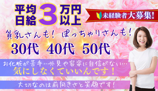 18歳以上(高校生不可)~50代まで大歓迎! 姉妹店にぽっちゃり系・人妻系があるので、容姿や年齢を気にせずご応募いただけます! 10代.20代.30代.40代.50代、ニューハーフさんもOK! 頑張る気持ちさえあれば採用!