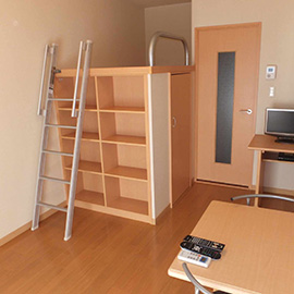 蓋付きの荷物入れ、上着の上から視界を妨げる為のスーツケースがお部屋に備え付けてあります。