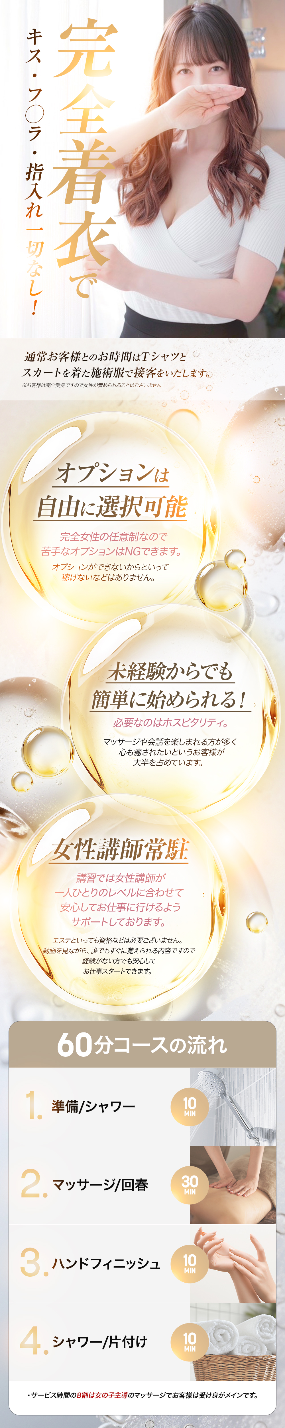 30代を中心とした大人の女性が多数在籍。エステ経験は一切不問♪ 未経験の方も大歓迎です♪当店は脱がない・舐めない・触られない🙅♀️業界未経験でも安心して始められるソフトサービスのみのお店です✨