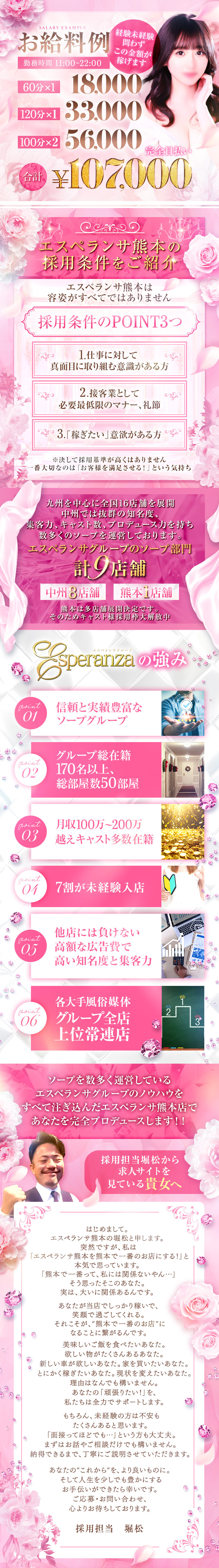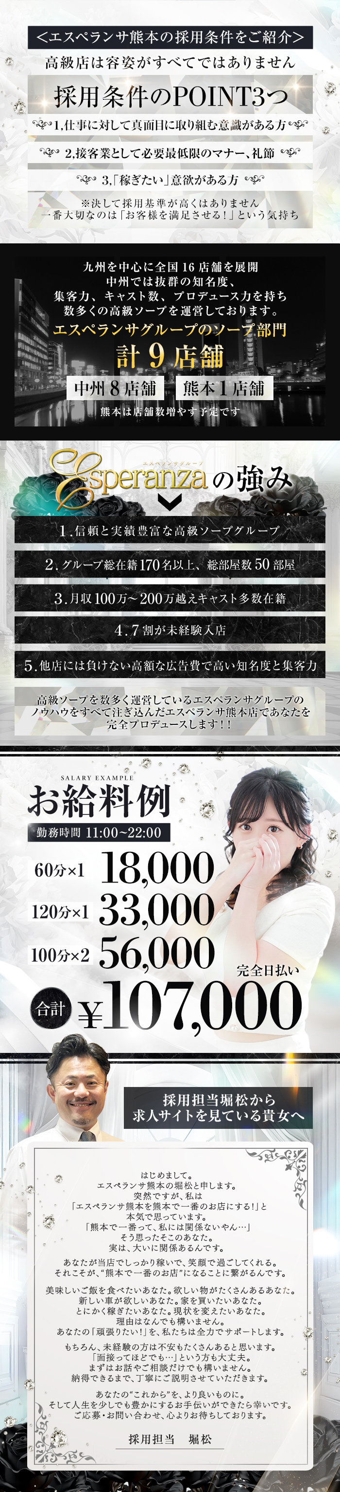 エスペランサでは、女性講習員・スタッフが同じ女性目線でキャストに負担がかからないよう配慮しており、働きやすい環境です。高級店なので、日給で10万円以上も可能!