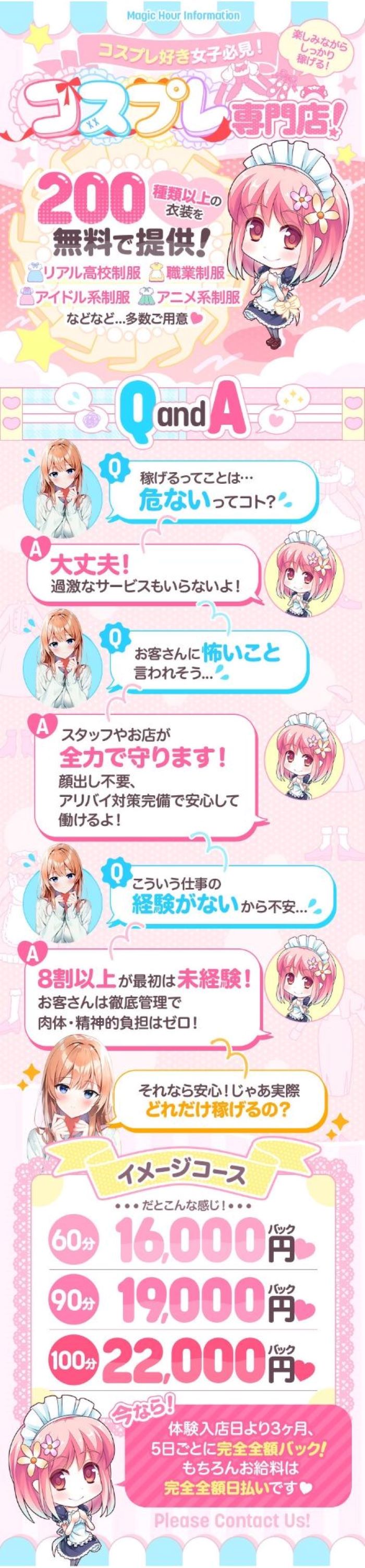 コスプレ専門×店舗型♪楽しく安心して稼げる!200種類以上の衣装を無料で提供!8割以上の女の子が未経験で始められています(*´ω`*)即日面接&体験入店もOK♪