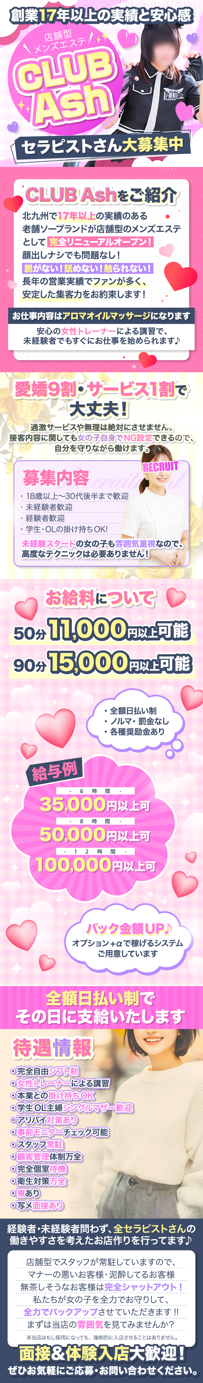 創業17年以上の老舗ソープランドCLUB Ashが2025年10月1日より【店舗型メンズアロマエステ】として完全リニューアルオープン!!『脱がない』『舐めない』『触られない』・・・笑顔と愛嬌で楽しく稼げちゃいます♪