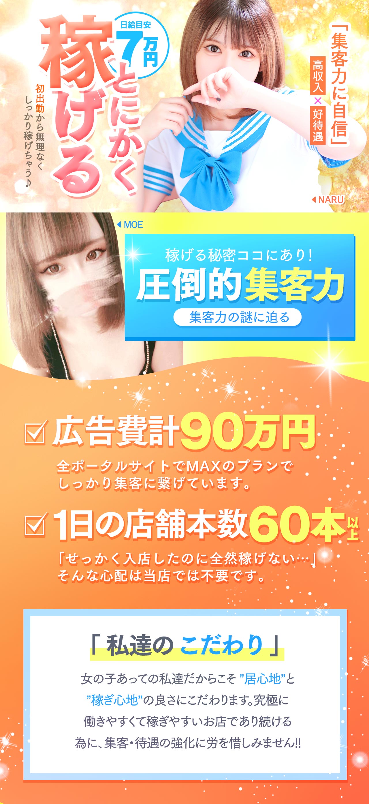 未経験から「日給10万円」が当たり前!当店は創業47年以上の歴史を誇る、信頼と実績のソープランドです。複数のサイトでランキング上位独占中の圧倒的人気店✨たしかな集客力で、新人さんでも顔出しなしでもしっかり稼いでいただけます✨