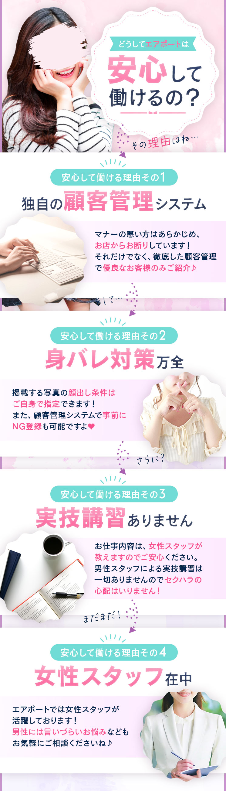 安全対策がしっかりしているので、安心してお仕事ができるお店です。最初にお店を選ぶときに「トラブルがないか」「怖いお客様はいないか」などが不安でしたが、実際に働いてみて、スタッフさんのサポートが手厚いことに驚きました。受付の段階でしっかりお客様をチェックしてくれるので、変なお客様が入ってくることもなく、安心して接客できます。もし困ったことがあれば、すぐにスタッフさんが対応してくれるので、不安を感じることはほとんどありません♪ お店選びで迷っている方は、安全対策のしっかりしたエアポートを選ぶと安心ですよ!