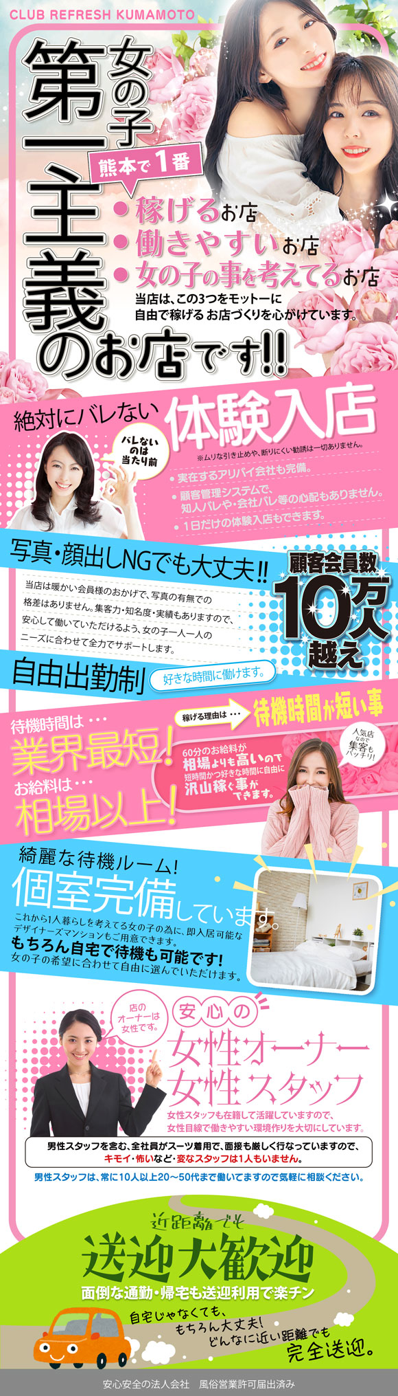 即日体験可能【1日70,000円保証】1泊2日で15万円完全保証!熊本トップクラスの人気店です♥サポート体制万全、素人コンセプト店だから未経験大歓迎!