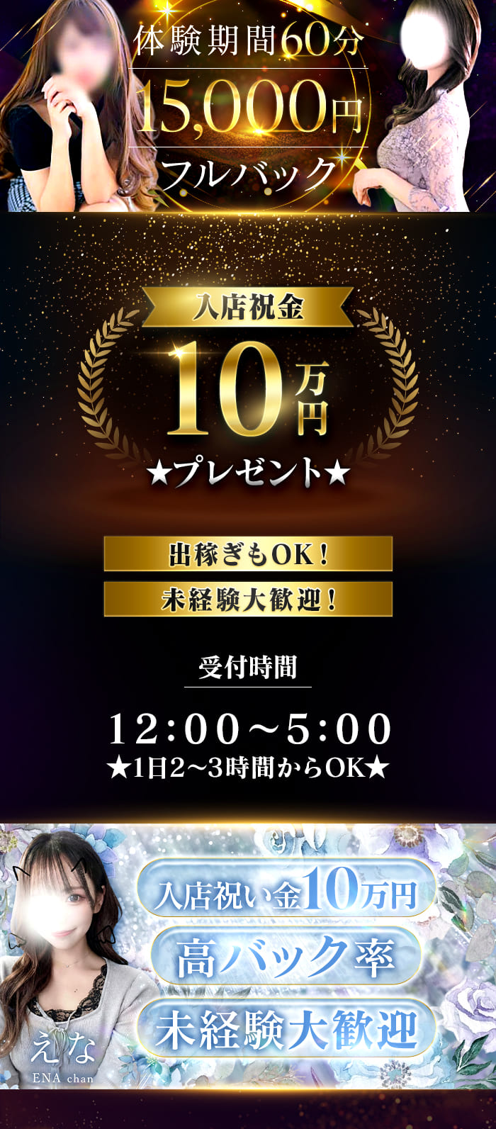 入店祝金10万円プレゼント☆高額体験特典もございます!そのほか様々な好待遇をご用意しています。