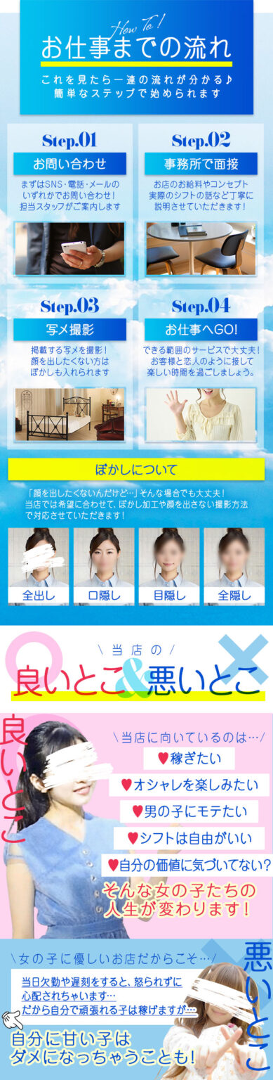 各種待遇も充実!アリバイ対策&衛生対策万全、顔出しの強制なし!女性講習費や撮影代なども無料です♪安心してスタートできます