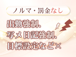 ノルマ・罰金なし!出勤強制、写メ日記強制、目標設定などは一切ありません。プレッシャーのない環境で働けます♪