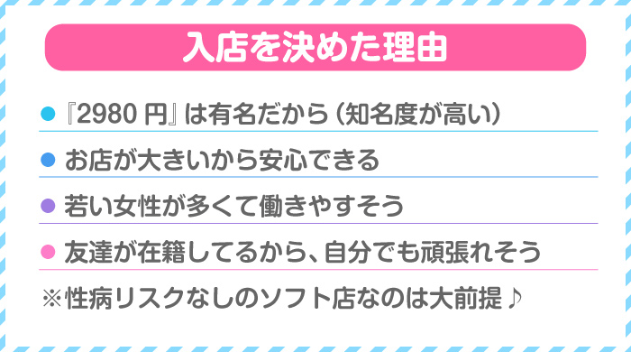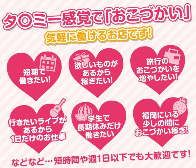「ちょっと空いた時間でお小遣い稼ぎがしたい」「未経験だけど安全なお店がいい」など、どんな理由でも構いません。不安なことがあれば、私たちスタッフが全力でフォローします。ぜひ、お気軽に応募してください。お待ちしております!