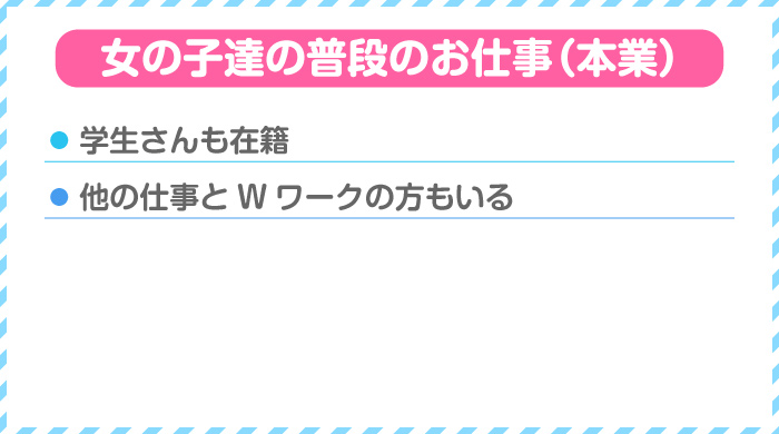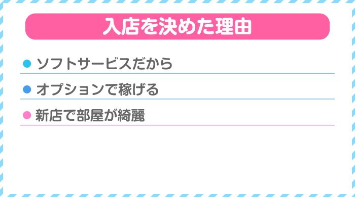 ソフトサービスのため単価は低いお店ですが、オプションがガッツリ入ればお客様の支払額が1万円、2万円になります。かなり稼がれている女性も実際にいらっしゃいますし、身体の負担なく効率よく稼げるお店です。