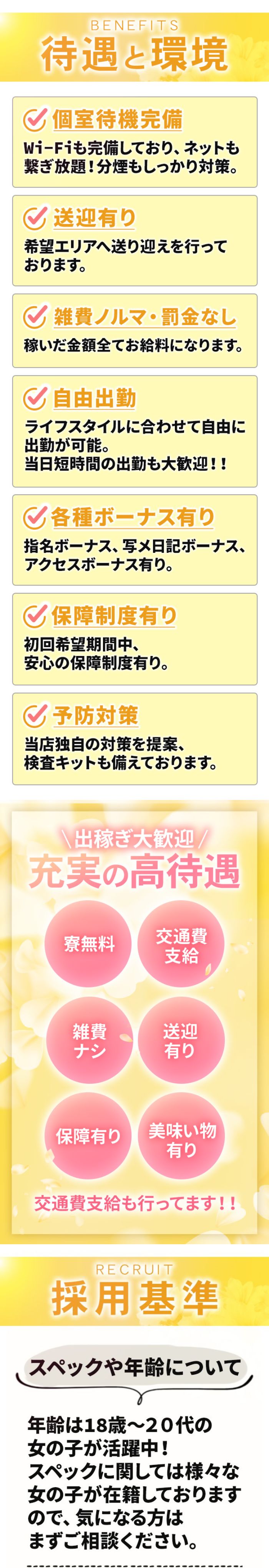 - ノルマ/罰金なし 自由出勤OK 個室待機可 自宅待機/勤務可 託児所紹介あり 寮あり 送迎あり アリバイ対策あり 性病対策あり