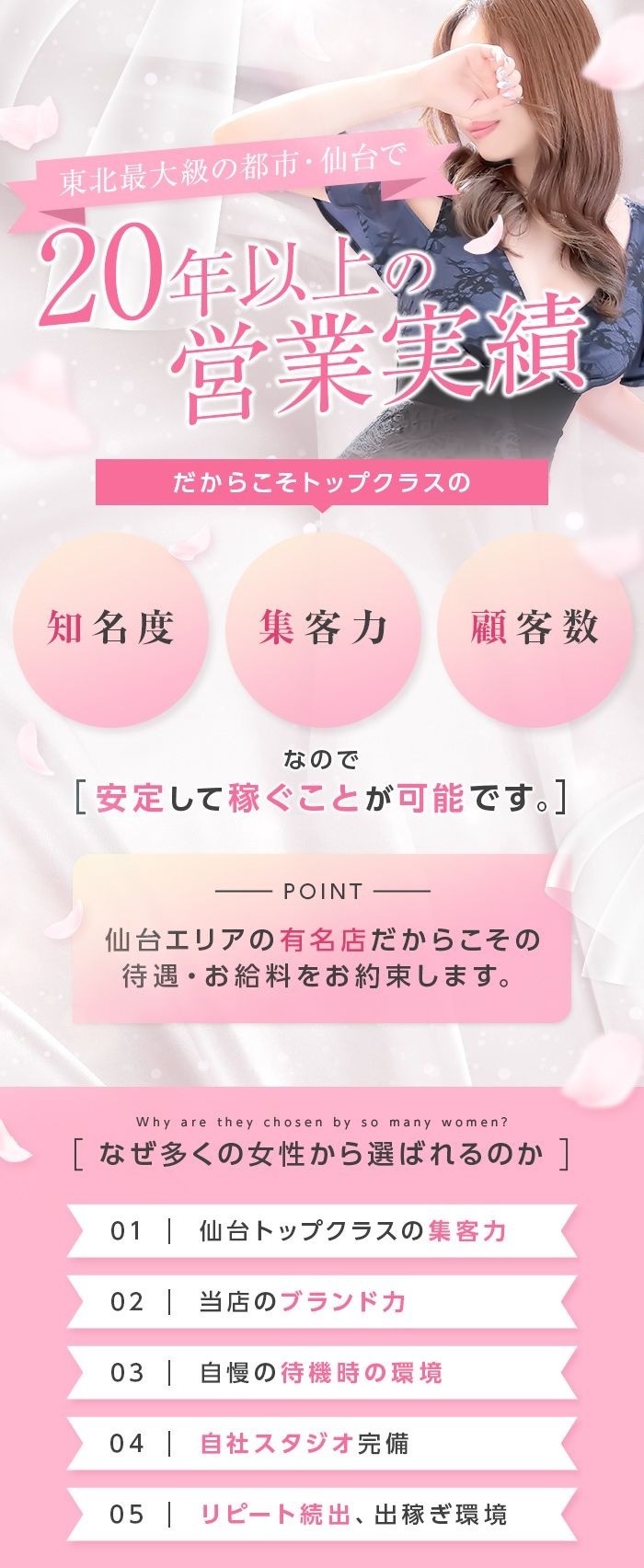 女の子1人ひとりに合った働き方を提案し、未経験スタートの方も安定した高収入を稼げるようにサポートしている同店。「東北トップクラスのお給料を実現しております。2、3日でOLさんの月給を軽く上回ることも可能ですよ!」と、店長の高橋さんが話してくれました。
