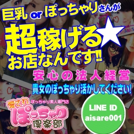 ぽっちゃりさん大募集!風俗バイトが初めての女性でも大歓迎しています(*^-^*)【愛されぽっちゃり倶楽部】当店はaisareグループ(法人経営)が運営する、ぽっちゃり専門デリヘル店!「日払いで稼ぎたいけど風俗が初めて」「体型に自信がない…」「どんなお店を選べばいいかわからない」そんなぽっちゃり女子はぜひ当店へ♡★法人経営のグループ店なので、環境整備や待遇の充実、お給料の支払い管理などがきちんとしていて、はじめての女性でも安心してお仕事できます。→風俗やデリヘルが初めてで、どんなことをしたらいいのか、何から始めればいいのかわからない方でもお店がきちんとサポートします。なんでも相談してくださいね(*´ω`)→顧問税理士や行政書士もおり、法人として「女性の安心・安全」を守れるように運営しています。★ぽっちゃり専門店だから同僚はみんなぽっちゃりさん!お客様もぽちゃ好きなので、コンプレックスをチャームポイントに変えて働けます♪★大崎エリアで珍しいぽちゃ専門店なので、ライバル店が少ない…つまり周辺エリアのぽちゃ好き男性のハートは当店が独り占め!→集客力があるということは、出勤してくれた女の子がしっかり稼げるということです。お店選びで迷っているなら、あなたのチャームポイントを最大限に活かせる当店へぜひ!→ちなみにぽっちゃり風俗というと激安で過激なお店もあるのですが、当店は可愛らしくて優しい雰囲気のホームページでお客様をお迎えしています。まさに「愛され」ぽっちゃり店♡(*´∀`).。o○こんな子大歓迎◯・ちょいぽちゃ、ぽっちゃり、激ポチャ、巨乳・清潔感、ふくよかさ、安心感、優しさ、ちょっとエッチ…など当店のお客様が求める「こんなぽっちゃりさんだといいなぁ」がある女性・素人さん・出戻りさんもOKですよ~!【変わりたい】【稼ぎたい】【夢や目標がある】そんなぽっちゃり女性を大歓迎!年齢層も20代~30代、40代OKなので幅広いです(っ ` -´ c)ギュ他県からの出稼ぎご応募・ご相談もOK♪ほんの少しの勇気を出して、ぜひ【愛されぽっちゃり倶楽部】へご連絡ください。