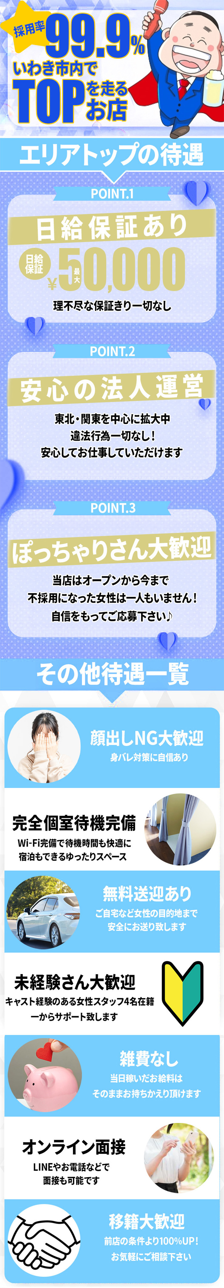- ぽっちゃり歓迎 30歳以上歓迎 40歳以上歓迎 50歳以上歓迎 未経験者歓迎 タトゥー/傷跡OK 容姿不問 掛け持ちOK 短期歓迎 出稼ぎ歓迎
