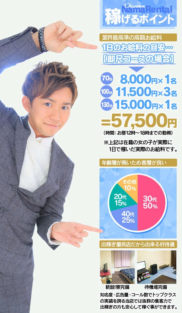 ~保証制度あり!最大で月80万円保証します!~●『人妻生レンタル』なら「顔出しなし」で働ける!●『人妻生レンタル』なら「スタッフ教育」が行き届いている!●『人妻生レンタル』なら「とにかく稼げる」!!!お給料のこと、貯金のこと…『人妻生レンタル』にお任せください。最短で夢に近づけるようスタッフ一同サポート致します★★未経験の方も、経験者の方もこんなことにお悩みではないですか?~~デリヘル店で働くときの不安~~●スタッフが怖い(または、だらしない)●自由出勤なのに出勤強制がある●顔出しなしって本当なの?●やたらと雑費が高い…●お店内でヒイキがあるような気がする●風俗卒業したいけど貯金が無くてなかなか辞められない…etc.~~~~~~~~~~~~こんなお悩みをお持ちの方、一度相談してみませんか?ノウハウのあるスタッフが頑張るあなたを全力サポート‼未経験の方でももちろんOKです♪♪人妻店なので女性たちも落ち着いた方が多く、キャスト同士も仲が良いですよ!撮影ヘアメイク付きにプチ整形費負担制度もあります。お仕事をしていたら男性にお褒めの言葉をいただく機会も多くなることと思います。どんどん綺麗になって、早いうちにガッチリ稼ぎましょう(*^^*)託児所紹介もあるのでお子様がおられる方も安心ですよ♪また、出稼ぎ・短期勤務の方も大募集中です!!入寮についてやどれくらい持ち帰りたいかなどヒアリングさせていただきます。面接予約だけでなく質問・疑問等も受け付けております!あなたからのご連絡お待ちしております。-