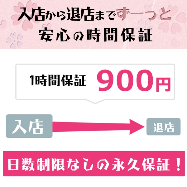 <入店から退店まで、ずーっと 時間保証> ■完全時間保証 ・時間保証900円(1日5時間) ※日数制限なし!退店まで永久保証! ■待遇 ・リピート指名料、市外交通費別途支給 ・完全日払い制度 ・厚生費や雑費など引かれるものは一切ありません。