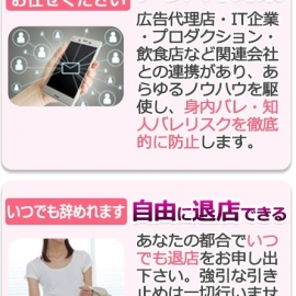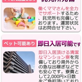 - 写メ日記強制なし ノルマ/罰金なし 自由出勤OK 個室待機可 自宅待機/勤務可 託児所紹介あり 寮あり 送迎あり アリバイ対策あり 性病対策あり 制服/衣装貸与 コスプレができる 女性運営スタッフ在籍