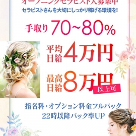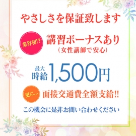 未経験の方大歓迎です! 主婦の方、学生さん、掛け持ちOKです♪ 出勤中に発生する「時給保証1,500円」や “業界初”講習を受けて頂く旅度にボーナスをお付けします。 独自の研修制度を設けており、未経験の方も安心安全に『稼げるセラピスト』になれちゃいます♪