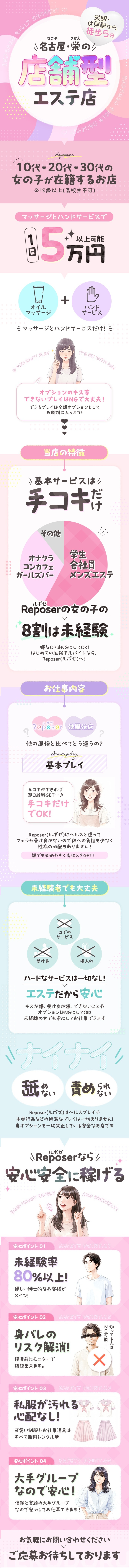 お触りや舐めたりするプレイ内容は一切ございません。お客様と会話を楽しみながらマッサージするだけ。舐めない・脱がない・触らない。フェラもないので安心してください。(オプションは出来るのだけで大丈夫!)そんなソフトサービスなのに『ヘルス』よりバックを高く設定させていただいております。他店で頑張っているのにお給料が上がらない、評価されない方は是非一度ご相談ください。そんなアナタを当店は応援します