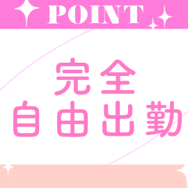 - ノルマ/罰金なし 自由出勤OK 個室待機可 自宅待機/勤務可 生理中勤務可 寮あり 送迎あり アリバイ対策あり 性病対策あり 制服/衣装貸与 受け身なし 裸なし 手だけ/見るだけ