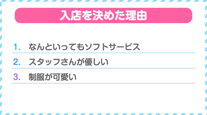 業種はソフトヘルスです。他のヘルス店と違い、コースごとに接客内容が変わるようになっていて、短いコースであれば触られる箇所が限られています。30分、40分コースだと上半身までで、下半身へのお触りはありません。なおかつ、攻めるような行為ができないため、お客様に受け身になっていただく形になります。